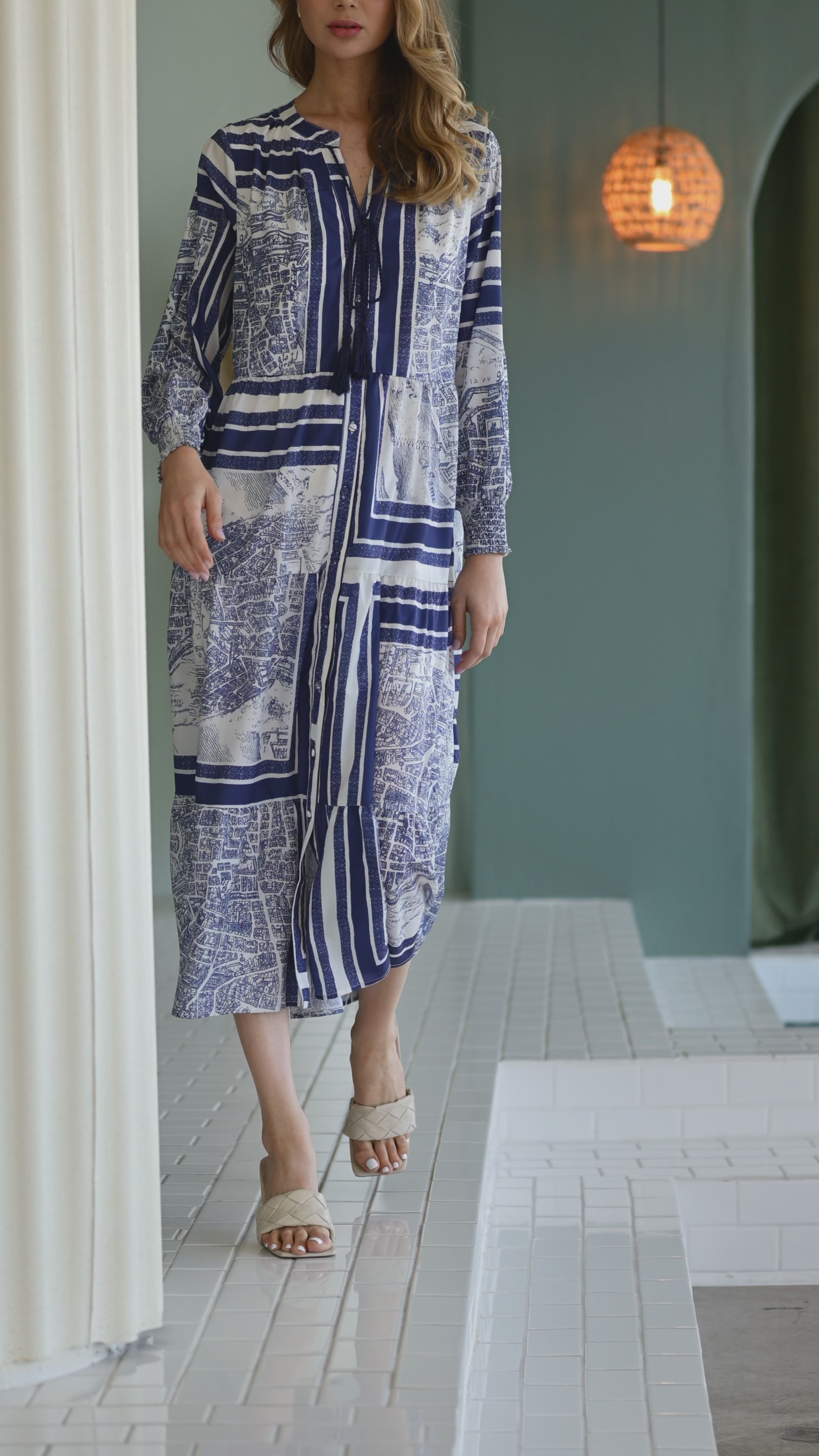 The Jesslyn Dress. A chic patterned maxi dress made with high quality woven fabric. Blue cityscape pattern. Round neck tie collar. Long sleeve. Pockets. Elastic wrist cuffs. Tiered dress. Easy relax fit. Stylist and comfort.